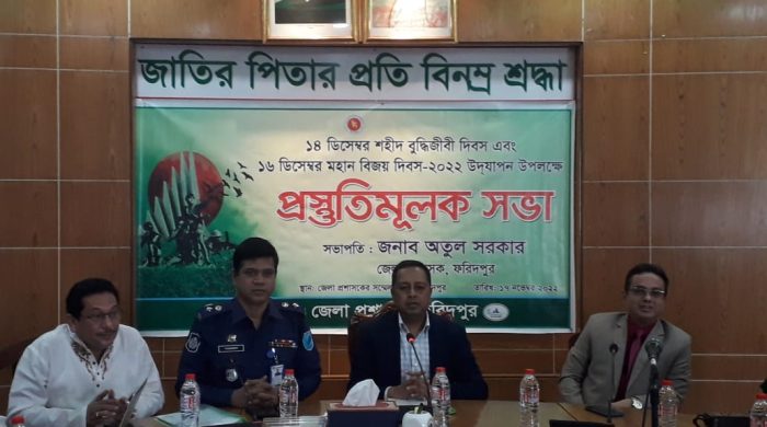 বাংলার আকাশ ডেস্কঃ ফরিদপুর জেলা প্রশাসনের আয়োজনে জেলা প্রশাসক কার্যালয়ের সম্মেলন কক্ষে জেলা প্রশাসক জনাব অতুল সরকার এর সভাপতিত্বে ১৪ ডিসেম্বর শহীদ বুদ্ধিজীবী দিবস ও ১৬ ডিসেম্বর মহান বিজয় দিবস